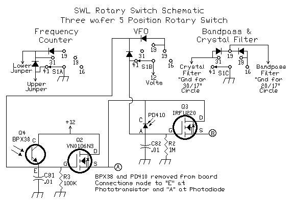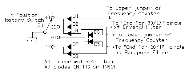 The receiver has its own rotary section and the frequency counter has its own rotary section. Some rotary switches have two sections on one wafer. These might be cheaper than a rotary with two wafers. Also, almost all now have more than four poles, i.e. 11, and are sold as universal rotary switches. They will work fine, just use four poles. Remember to use an RF Choke and .01 bypass capacitor at the jumper connections of the Frequency Counter when hooking up the counter section. See picture.
