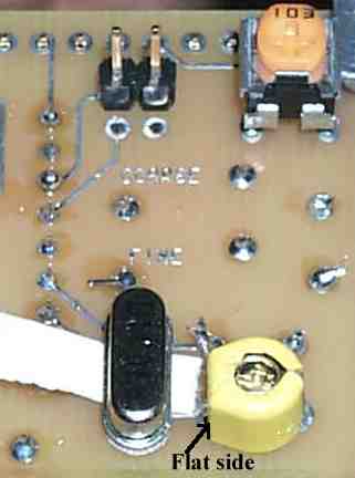 ![]() That is a piece of paper underneath the crystal so that I wouldn't accidently pull the crystal to the PCB board and ground the trace underneath it, as noted in the instructions. Pull the paper out after you solder the crystal pins. ![]() Notice the different type trimmer used on this board. Install the flat side as shown so the adjustment screw is grounded. Only one two-pin header is shown installed to show the orientation in which they are mounted - horizontally. Again, note the paper underneath the crystal to prevent pulling the crystal against the board and causing a short against the trace underneath. |