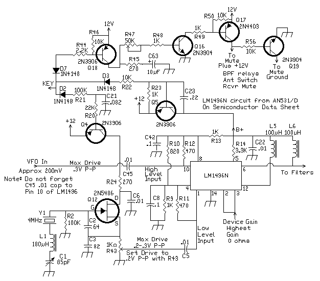 A double balanced Gilbert cell mixer, the LM1496N, is used to interface with a receiver. Since drive levels for the mixer are so low (~100mV to 200mV), a very low value capacitor (3.3pf would be a good starting point) can be used in the receiver to pick up the VFO signal. Low coupling capacitance minimizes pulling the dial calibration of the receiver. Cable length also plays a factor in the attenuation of the signal from the receiver. Be careful of really long cable lengths from the receiver to the 1496 that may lower signal strength too much. The LM1496 output circuit comes from the AN531/N On Semiconductor datasheet. The output circuit with the 2 RF chokes and single ended output allows a broadband output in the HF frequency range. The broadband output of the LM1496 allows any combination of frequencies at the inputs of the LM1496. Make sure you don't have an in-band signal by mathematically running your mixer products to the third product. An example is using a 3.547 MHz crystal with a 10.547 MHz VFO for 40 meters. The 3.547 MHz crystal doubled to 7.094 MHz - right in the middle of the band! The VFO input for this schematic is 14 MHz with a 4 MHz oscillator for operation on 30 meters and an 11 MHz VFO for operation on 40 meters. The VFOs are switched in the receiver for the two bands when used with the Electroluminescent Receiver. The frequency of the crystal in the oscillator, added to or subtracted from the VFO, generates the frequency of the transmit signal. If the receiver is a single conversion superhet, the first oscillator of the receiver might be used. Use the receiver oscillator signal (with a coupling capacitor for .2V P-P drive) in place of the oscillator and input into Pin 1. However, the receiver oscillator may not place the output signal at the right offset for CW operation unless the oscillator is pulled with a switched varactor or capacitor in the oscillator tank circuit. If the oscillator (Q12) is the same frequency as the crystal filter in the receiver, shielding the oscillator will prevent it from getting into the receiver. No problem with chirp or pulling was noticed with this design. Crystals can be ordered from ICM (Oklahoma City, OK) or Peterson's crystals at reasonable prices. L1 and C1 can be used to pull the crystal to get the proper offset for CW operation. The 180uH value for L1 was the best value for pulling a 4 MHz crystal. For standalone operation, build the VFO for one-half the frequency you want to use, feed both inputs to the LM1496 and let it double the frequency of the VFO. A low frequency VFO has better stability. ![]() The circuitry near the top of the schematic (Q5) (shown above) is the shaping circuit for keying the LM1496 and and the shaping circuit (Q4) for keying the oscillator. The oscillator is keyed slightly before the 1496 so the oscillator has time to stabilize before the 1496 mixer is turned on. The delay time is in milliseconds with R21/R20/C21/ with Q4 and R22/R23/C23 with Q5 determining the timing and shaping of the keying. The schematic in the Flying Pigs article showed Q4 also supporting the mute function for the receiver. That upset the timing for the oscillator and was removed. Q4 is dedicated to the oscillator and can't be used for anything else. The mute function was moved to Q17 along with Antenna switching and relay switching of the bandpass filters (when used with the ELR). See the schematic below. |