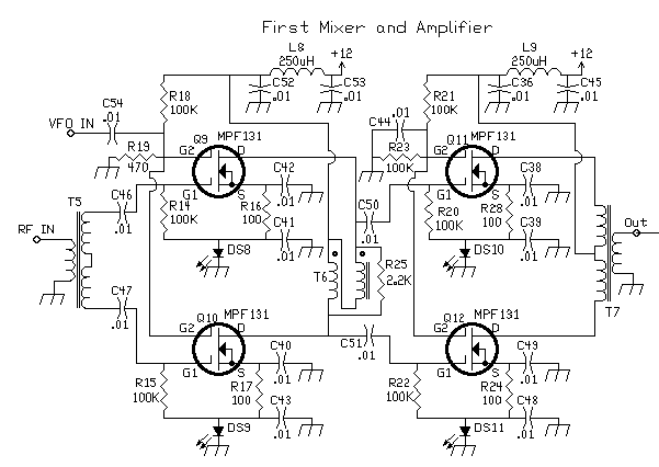 The Single Balanced Mixer/Single Balanced Amplifier Combination DiscoveryThe main problem of the oscillations was the strong VFO energy (6 volts peak to peak, or +7dBm) going through the mixer to the input of a single MOSFET post amplifier. The VFO signal, combined with the second and third harmonic signals, would drive the amplifier to oscillate. I had tried using the MOSFET single balanced amplifier as the post mixer amplifier, but the excessive use of transformers kept me from seriously considering it. Both the mixer and the amplifier has a 1:4 at the input and output, and putting them together would put two transformers in a row. While looking at the two sitting in a row, I pondered how this might be made into a quad mixer. This could eliminate the transformers between the circuits. I looked in the 2000 ARRL Handbook and came across Colin Horrabin's, G3SBI, quad FET mixer. After looking at how he used his transformers, I came up with the idea of tying the single balanced amplifier into the input leads of the output transformer of the mixer. This worked great. It was solid as a rock. Never could get it to oscillate, even with my signal generator in overdrive. The capacitors (.01s) on either side of the middle transformer are the coupling capacitors to the amplifier. They go to Gate 1, with a 100K resistor to ground. G1 is marked on the mixer and amplifier MOSFETs. In probing the circuit with an SA, the mixer and amplifier seemed to work as one unit. Any measurements between the mixer and amplifier were never completely trustworthy. The gain measured at the output of the mixer would be the same gain at the output of the amplifier. But when the two were disconnected, the gain of the mixer would be 10 dB less. The single balanced MOSFET amplifier can handle the excessive VFO energy from the mixer without oscillating and provides 7db of gain. |