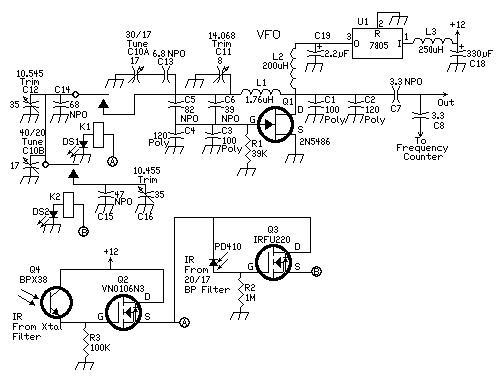 The picture is a top view of the board. This board contains the front end of the receiver: the VFO and VFO amplifiers, the RF amplifier, Bandpass Filters, first mixer, post mixer amplifier, and crystal filter. |