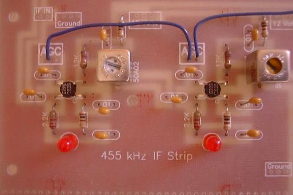 At the upper left is the Second Mixer. This Mixer is fed RF from Board 1 at the box labeled "Xtal Filter In". This signal is mixed with the crystal oscillator located at the far upper right. The Crystal Oscillator is amplified by a MOSFET amplifier. Unmarked holes are at the output of the crystal amplifier to place a one crystal filter. The filter will eliminate the second harmonic of the oscillator and decrease phase noise. But careful tuning of the oscillator frequency is needed to minimize the losses through the filter. An oscilloscope or an RF measuring device is needed to properly set up the one crystal filter. The output of the Second Mixer goes to the 455kHz IF amplifier chain. The first two 455kHz IF amplifiers are used to amplify the signal for delivery to the Product Detector. The third amplifier is an AGC amplifier, which sends its signal to a 1N270, a germanium diode with low forward voltage drop. The resulting current from the 1N270 is sent to the AGC circuit, which is similar to the one in the Progressive Communication Receiver. The output from the AGC regulates the voltage on Gate 2 of the MOSFETs which controls the gain of the IF strip. Two jumper wires are used on this board that connect the bold lined boxes named "AGC". These wires connect the AGC voltage to all the IF amplifiers. Since the LEDs are in the drain/source circuit of the MOSFETs, they show the variation of the AGC voltage. This makes for a 'flashing display' which follows CW notes and the fading of SSB signals. After the second IF amplifier, a signal line runs down to the product detector through a 455kHz IF filter. The filter is very broad (6kHz) and is used to block noise from the IF strip. There are footprints for two 455KHz filters, but only one is used. The two footprints cover 99% of the 455kHz filters made, so any available filter may be used. The product detector uses Schottky diodes providing a very low loss product detector (part number HP5082-2877). The difference between the Schottky diodes and 1N914s was detectable in the audio at the speaker. On the bottom left of the board is the BFO followed by a variable gain MOSFET amplifier. This amplifier helped considerably in reducing noise. Since there is abundant amplification, the 455kHz IF can in the output of the amplifier is detuned by running the slug all the way to the top, and the gain adjust of the amplifier is adjusted for the audio output desired by the operator. If the LED at the BFO amplifier is just barely on, it will provide the cleanest output at the speaker. On the right of the product detector is the audio pre-amplifier. After some complaints that the B&E receiver didn't have enough audio output for some people, and is a problem noted in a lot of articles about receivers, the receiver was designed to have plenty of audio gain. The "Gain Adjust" capacitor in the Pre-audio Amplifier is used if more audio output is needed. Recent tests have shown that a 2.2mfd capacitor is the best value to use. A 12" woofer speaker can be driven with this capacitor installed. For those who like a lot of audio, add the "Gain Adjust" capacitor. The audio amplifier is the TDA2002, a very common audio amplifier used in commercial radios. This amplifier has a maximum output of 8 watts into a 4 ohm load. A 4 ohm speaker should be used with this amplifier, though a 8 ohm will work, with slightly reduced volume. The Audio Amplifier likes a high wattage 4 ohm speaker. For those who wear headphones, a low impedance set will plug right in. Just be careful with the audio control! |