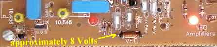 Cut a 1 1/2" piece of Black Shrink tubing supplied with the kit in Bag 6. This will be used to block light to the Photodiode and Phototransistor when needed to set frequencies. First, the 14.000 MHz VFO Frequency![]() Place the black tubing over the Phototransistor located between the VFO amplifiers so both LEDs are turned off at the relays - 10.545 and 10.455. See picture above. Be aware that a strong light shinning on the back of the Phototransistor will also turn it on, so if the tubing doesn't turn off the LEDs cover the back side of the Phototransistor also. Adjust the ceramic 2/8 trimmer to the frequency shown in the picture (14.468 or so). Adding the tuning capacitor will drop the 14.000 MHz VFO frequency by 400 kHz, so it is set 400 kHz high, When the stabilizer is used, the metal adjustment screw on the 2/8 ceramic trimmer is not grounded. When using a metal screwdriver, calculate how much it changes the frequency when you touch the adjustment screw and adjust accordingly. Spread apart or squeeze the windings on the VFO toroid to help reach the frequency. Try to get the setting with the 2/8 ceramic trimmer near its middle position. Line up the slot in the adjustment screw with the capacitor pins, with the rotor plate on the end with the arrow. The rotor plate is the part of the top with the metallic color. If you can't get above 13 MHz, remove one turn from the VFO toroid. If you wound only 18 turns on the toroid you will have to squeeze the windings together a bit. The toroid shown has 19 turns, which is the number recommended when using the stabilizer. Accuracy is not important, just get close. When the tuning capacitor is installed and the board is in its final mounting position the frequencies will be touched up. To immolate the stabilizer being connected, touch the "Stabilizer In" wire to the 5 Volt pin on the 5 volt regulator - the one on the left (toward the VFO) next to the 2.2mfd electrolytic capacitor. The frequency should raise 10 to 20 kHz. Place the wire back on the grounded regulator tab, the frequency should drop 10 to 20 kHz. By the way, accidentally touching the "Stabilizer In" wire to the 12 Volt pin on the 5 Volt regulator will not do any damage. Second, setting the 10.545 VFOMove the black tubing from the Phototransistor and place it over the Photodiode near the 10.455 relay. The LED at the 10.545 relay should be on and the LED at the 10.455 relay should be off. ![]() Set the frequency to 10.808 MHz or so. The tuning cap drops the 10.545 MHz VFO approximately 263 kHz. Again, not critical at all, just close. Third, setting the 10.455 VFORemove the tubing from the Photodiode so both LEDs are on at the VFO. See picture below: ![]() Set the frequency to 10.701 MHz. The tuning capacitor drops the 10.455 MHz VFO approximately 247 kHz. Again, not critical, just get the setting close. To test the stabilizer varicaps, touch the "Stabilizer In" wire to the 5 Volt pin on the 5 volt regulator - the one on the left (toward the VFO) next to the 2.2mfd electrolytic capacitor. The frequency should raise approximately 130 kHz. Place the wire back on the grounded regulator tab, the frequency should drop back to 10.701 kHz. When the Stabilizer is connected and is reset, the voltage to the varicaps is 5 Volts. So the same changes that are seen when connecting to the 5 Volt regulator will be seen when the Stabilizer is connected to the receiver. Final setting of the VFO is done after the Stabilizer is connected to the receiver. Remove the "Stabilizer In" test wire when the frequencies have been set. If all went well, then continue to the next section. |