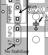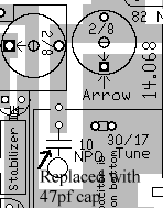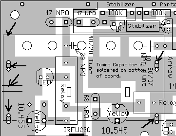 ____2 - LEDs (Bag 3), Red color, next to relays. Match flat of the LED to the flat on the footprint. The short lead is on the same side as the flat. Note: If you ordered the Super Bright LEDs, one can be placed next to the 1N914 diode. See Modifying the LEDs. Note: The Yellow Trim cap at the 10.455 text tunes the 41 meter band. With no modifications, the VFO will tune the 41 meter band from 7.300 to 7.6 MHz. If the lower end of the 41 meter band is desired, 7.100 to 7.300 MHz, solder a 20pf NPO (SWL parts bag) capacitor across the two unmarked holes next to the yellow trim capacitor. See picture below: ![]() Bend the leads about 1/8" away from the body of the diode for easy insertion into the PCB. ![]() ____1 - 2/8 Ceramic Trim cap (Bag 1), Note arrow over one leg, match the arrow on the trimmer to the arrow on the footprint. Clean and tin the leads to make sure of a good connection before soldering on the board. Note: Placement depends on whether you are using the stabilizer. If you are using the stabilizer, the trimmer goes inside the stabilizer parts box as shown above. If you are not using the stabilizer, the trimmer goes next to the 14.068 text. Solder |