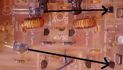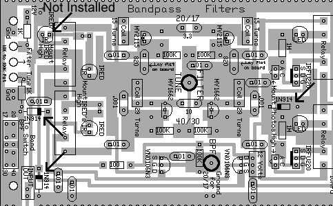 The IR LED next to the 20 meter bandpass output relay is not installed. Removal of this IR LED is no problem as it is in parallel with the 20 meter bandpass switching LED and its removal increases the available current to the switching LED. |