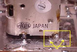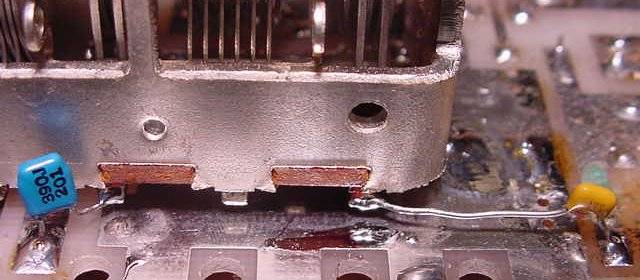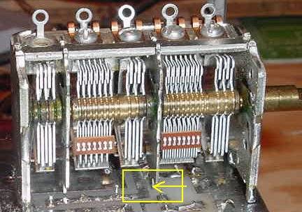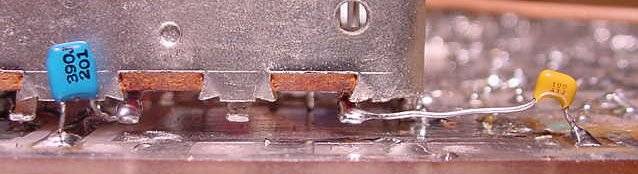 Note the traces that the coupling caps are soldered on. Be careful the wires soldered on the capacitor stator tabs do not touch the case of the main tuning cap. This is shown in the second picture. If the tabs were not bent enough, you can use a flat bladed screwdriver tip to bend them away from the PCB board, or down if the wires are touching the capacitor case. Check with a DVM to make sure if it is too difficult to see. |