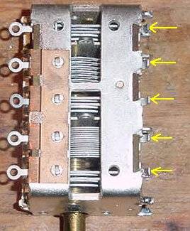 Mount the coupling capacitors that go to the VFO. The tabs are difficult to reach after the main tuning cap is soldered to the board. Notice that the caps are soldered to different tabs than when mounted in its previous position. The capacitance of the sections will be the same for either mounting position, so there is no change in the coupling capacitor values. The picture below shows the sections that are used when mounted in the original location. Note the first and last sections are used. In the new location the third and last sections are used. The first, third, and last sections are all the same value. ![]() |