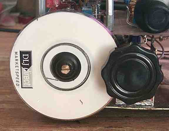 A 3/8" grommet is pushed over the potentiometer shaft all the way back as far as it can go. A small piece of PCB material is cut and drilled so the pot can be mounted. With the CD-ROM in place, the pot mounted on the PCB material, the rubber grommet mounted on the shaft of the pot, the whole thing is pushed up against the CD-ROM with fair pressure and the PCB is soldered to the ground plane. Use only small tacks of solder until you feel you have the right amount of pressure. After the pot is tack soldered on the ground plane, put a knob on the CD-ROM and see how it works. A whole lot of pressure will push the CD-ROM out of place, but just the right amount of pressure will turn the CD-ROM without slipping. The edge of the CD-ROM can be sandpapered to get a better grip on the rubber grommet. I have not found this to be necessary in most cases. |
