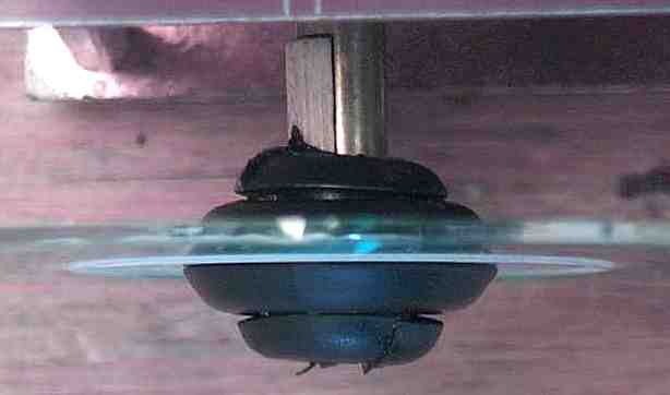 Shown here is a rubber grommet on the capacitor shaft, with the wooden spacer made from 1/4" wooden dowel purchased from the local hardware store. |