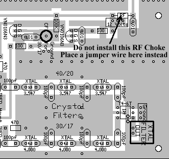 >Put the .01 capacitors in first. There are 95 of these. The values are inside the footprint for easy identification and the edges of the footprint are rounded. Remember, all the rectangle footprints that are rounded indicate capacitors, those that are squared off indicate footprints for resistors. >Put in the 28 100 ohm resistors next. The values are inside the footprint. Remember, square edges for resistors, there are some 100pf capacitors that go on the board, but the values are on the outside of the footprint and the edges are rounded. >Then put in the 32 100K resistors. The values are inside the footprint. Keep in mind which ones your are putting in so you don't put a 100K where a 100 ohm goes, and vice-versa. The 100K's are easy to spot because of the bright yellow band on one end. Do not go nuts over finding every single footprint for the above parts. Put in as many as you see, and then put the others in (as you find them) when you populate the board with the other parts. >The rectangular footprint with square edges that has "RF" inside the footprint are for the 250uH RF chokes. Note that there are two footprints for "Large RF", those are for the large wirewound chokes in the same bag as the smaller ones. Note: There was an error made on the board concerning the RF Choke next to the "12 Volt" box above the VN0106N3 switching circuitry on Board 1 next to the Crystal Filters. Do not install that RF Choke. Install a jumper wire instead. See the picture below: ![]() Installation of this choke will cause the First Mixer to oscillate.