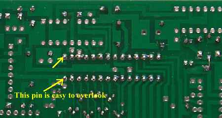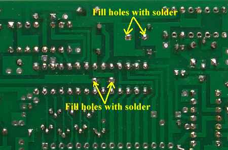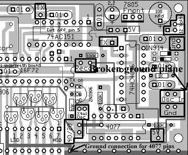 Fixing Ground Plane ErrorThere is a break in the ground plane on the right side of the board (viewed on bottom side). This break will be fixed on most of the boards sent out, but you must double check this first and fix it if not previously done. If fix is done, click here to skip to next step.![]() This ground plane break will cause problems when the boards are cut across the holes. On the bottom of the picture above you will see "Ground Connection for 4077 pins". If this hole is cut so that the copper does not connect the top and bottom grounds, the 4077 will lack a ground connection. Fixing the ground plane break on the right side of the board will fix the ground for the 4077 IC. If the 4077 IC is not grounded the counter will be locked with a blank readout. ![]() Closeup picture of the ground plane brake.