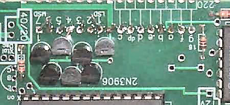 ___First - Cut transistor from cardboard. Transistors which have straight leads need a slight offset for the center lead as shown on the far right transistor in the picture above. It is not necessary to push the transistors against the PCB. The footprint for the transistors was necessary because of the tight fit between the traces for the LED readout and that meant a slight offset for the center lead was needed. 7 - 2N3906 straight leads ![]() Insert 3 2N3906 in the top row. Notice the flat side