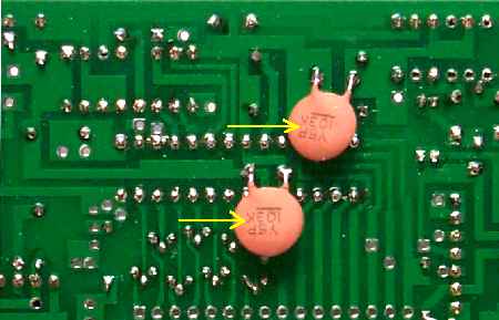 Make sure the black band on the diode is inserted the correct way. The wide white band on the footprint is where the black band should go on the diode. To double check, the bands should be opposite each other at each pair. Step 3 - Capacitors1 - .1 ![]() 8 - .01 ![]() 2 - .01 bottom side of board - Do not solder now! ![]() These will be put on the board in Step 8 after the ICs and 10 MHz oscillator have been soldered on the board. Step 4 - 2N3906 TransistorsIf you get flared leads on all 8 of the transistors, see picture below, straighten the leads of seven transistors before inserting into the board.