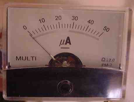 The meter is shown mounted on Board 2. Silicon sealant is used to hold the meter in place and works very well. The meter is not illuminated. This meter is the value the kit is designed for, 50uA. No changes on the board are necessary with this meter. Also, the the S-Meter is the most sensitive with this value. The higher value meter you use, the less sensitive it will be in the circuit. |
