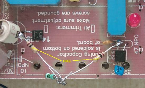 Solder the varicaps between the trimmer/capacitor and the original ground connection. Be sure you have the cathode connecting to the trimmer/capacitor. Solder a high megohm (equal or greater than 2 megohm) resistor to the ground connection shown on the board. This will provide a standoff to solder the 100K resistors from the varicaps. |