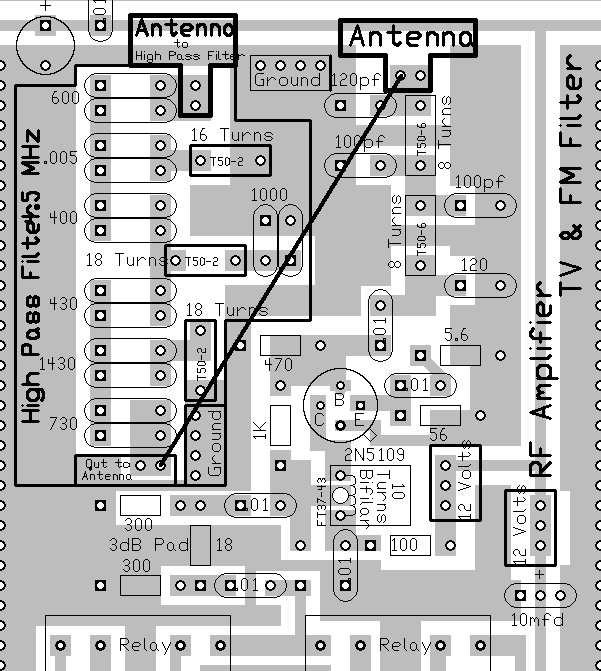 Below is the layout of the filter showing where all the values for the 4.5 MHz Filter are placed. There are two footprints for each value which gives room to make up the capacitance needed with two capacitors in parallel. Some of those values may be hard to find. Being able to parallel a couple of capacitors makes it easier to get values close to the ones in the filter. Notice that a wire is run from the normal Antenna Input to the output of the filter and the antenna connection has been changed to the Antenna Input at the top of the Broadcast Filter. |