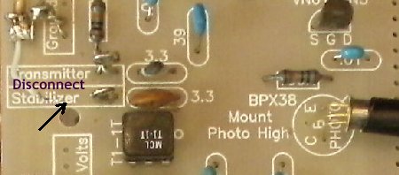 The receiver VFO was designed for three different frequencies. The procedure was to set the inductance of the coil at the average of the frequencies. For example, the kit uses 14 MHz and 10 MHz. The coil's inductance was set for a VFO design frequency of 12 MHz. The capacitors were calculated for a design frequency of 14 MHz. The capacitors were installed, along with a small ceramic trim cap between the coil and ground, so the ceramic trim cap could tune through the target frequency. On the first leg of the VFO, switched by the first relay, a 68pf, a 47pf, and a yellow trim capacitor is added to reach 10.545 MHz. On the second leg, switched by the second relay, a yellow trim capacitor is added to reach 10.455 MHz. The highest frequency (14MHz) works with the 4.000 MHz crystal filter. Subtracting 4 Mhz (crystal filter frequency) from the 14 MHz VFO frequency, the receiver will work at 10 MHz (30 meters). Adding 4 MHz to the 14 MHz VFO frequency, the receiver will work at 18 MHz (17 meters). The same band imaging techniques that were used to set up the amateur radio bands can be used for the SWL bands. Another example, using a 13 MHz VFO, subtracting 4 will give you the 9 MHz SWL band, then adding 4 will give you the 17 MHz SWL band. The second and third VFO frequencies are calculated with the 3.547 MHz crystal filter. Adding the 3.547 MHz crystal filter frequency to a 10.453 VFO frequency will yield 14 MHz (20 meters). Subtracting 3.547 MHz from a 10.547 VFO frequency equals 7.000 MHz (40 meters). Modifying Receiver FrequenciesTo reach different bands the IR receivers, the phototransistor and photodiode, at the VFO can be replaced by SPST switches. Then any combination of crystal filter, VFO frequency, and bandpass filter can be used. To disable the IR switching, just put a black cap over the lens of the Phototransistor and Photodiode controlling the VFO frequencies. The Phototransistor is between the VFO amplifiers, and the Photodiode is next to the 10.455 yellow trimmer. I used heat shrink tubing, folded over and then heated with a cigarette lighter. Tie one side of the SPST switches to the "A" terminal of the photodiode and the "E" terminal of the phototransistors, which is the gate lead of the switching MOSFET/MESFET. The other side of the switch ties to 12 Volts. Remember that the 10.545 relay on the VFO must be on for the 10.455 relay to have power. SPST switches for the bandpass filters and crystal filters are installed on the board, and are switching to ground. |