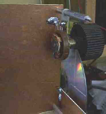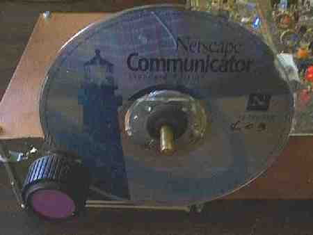 A junk box potentiometer is modified as a reduction drive. The back is taken off to remove the stop indentation. Now the pot can turn freely. Then a 3/8" rubber grommet is put over the shaft of the pot. The pot is mounted so that there is a fair amount of pressure against the CD ROM, so that it can turn the CD ROM without slipping. The slot in the outside diameter of the grommet makes a perfect place for the CD ROM to fit. Too much pressure will cause as many problems as too little pressure. In the picture, the pot was soldered to a soldering lug on the spacers, then the tension was effected by pushing against the CD ROM, and soldering the other lug to the ground plane. There are many variations on how this can be done. The illustrations above should give you the basics on how to do the operation in your special situation. |