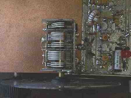 Three rubber grommets are used to hold the CD ROM onto the shaft of the tuning capacitor. A 5/8" rubber grommet is put inside the hole of the CD ROM first. Then two 3/8" rubber grommets are pressed inside the 5/8" grommet from each side. The 3/8" grommets will go in a little more than halfway, leaving the outside half showing on each side. This gives a very tight fit, and the two grommets in the middle provide a lot of stability for the CD ROM. Take the CD ROM to the hardware store when purchasing the grommets, as the dimensions are not always marked the same as the ones above. If the capacitor shaft is notched at the end, purchase a 1/4" wooden dowel stick, and split a short piece in half, and use it to round out the end so the grommets will be centered on the shaft when installed. |
