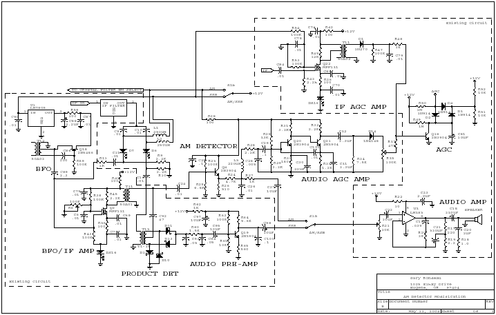 Downloading the .pdf file will be necessary to easily read the schematic. The following is a copy of the email Gary sent me with the schematic. He does an excellent job of explaining the circuit. "I came up with an audio derived AGC signal that I applied to your AGC transitor and used your timing cap for the decay. I found that I needed a fair amount of audio gain to drive the AGC so two transitors were required. "I also found that it works best with no filtering after the diode -- essentially setting the gain by the peaks detected. It was important to add a second RF filter on the input, and I biased the the frequency responce of the AGC amp toward higher audio frequencies to keep it responsive to static. "When I switch to AM mode, I power the AM detector and the Audio AGC amp and cutoff bias to the IF AGC AMP. In SSB mode, the AM detector/audio AGC amp is without power and the IF AGC Amp is provided with bias. "The output of both AGC amplifiers connect to the base of your AGC transistor through 1K resistors. The unused amplifier does not seem to bother the operation of the other one. I have an AGC level pot on the front panel fro the audio AGC. "I'll have to use it for a while to see where it works best.I initially built the AGC circuit on a bread board, but have since used the Dremel and drill technique to add the circuit to some of the available ground plane in the AGC section of the circuit board. "Using the audio-derived AGC makes SWL listening quite a bit more pleasant. You can now tune to the middle of the band and get the best signal. Fading is not as noticable. "Now with the stabilizer working better, you can tune a station, leave the room for an hour and come back and it is still perfectly in tune and sounds good!" Gary fine tuned the circuit for even better performance. The following email explains the problems and parts that were added as shown in the schematic above. "Naturally, the first AGC circuit I sent you wasn't quite right. When I put the scope on things, I discoverd lots of 455kHz in the AGC amp. "I added an RF choke and changed the detector capacitor to get rid of it. Then the AGC gain was all off so had to change all of the emitter decoupling caps to get more gain. "Then with plenty of gain, the circuit wasn't stable any more so had to add a little feedback stabilization cap... "Once it was working again, I found that to keep strong AGC action from popping too much, I had to couple to your AGC transistor with 47K (could even be larger perhaps) so the drive is not so high that it discharges the 10uF cap too fast. "Works pretty well now." |