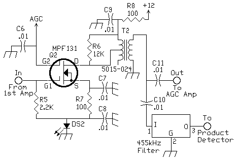 An inexpensive 6 kHz bandwidth 455kHz ceramic filter can be used between the Second IF Amplifier and the Diode Product Detector. This lowers the noise output of the IF amplifier strip. The one used in the receiver is the Murata SFU455A. ReferencesThe original inspiration for this IF strip came from the "Progressive Communications Receiver" in most of the recent ARRL Handbooks. That circuit is used at 9 MHz, uses two stages, and uses an LED (or two diodes in series) to raise the circuit ground of the MOSFETS. It is also a broadband circuit and could be used at any IF frequency given the limitation of the ferrite cores used. AGC performance falls with higher frequencies (10 mhz to 20 mhz), but works very well for 9 MHz and below. Another MOSFET IF strip worth looking at is "DX Receiver for the Ham Bands", by Ovi Florea, Ham Radio, December 1976, Page 10. His MOSFET amplifiers used a minimum of parts with 455 kHz Radio Shack cans, but does not reference the sources above ground, or use any 'oscillation tamers' (resistors across the output coil or ferrite beads) on the MOSFETS. I have found that when source resistors of 270 to 470 ohm are used (as in Florea's circuit), that the gain of the MOSFETS is considerably lower than when 100 ohm source resistors are used. This may be how he gets away without the "oscillation tamers".