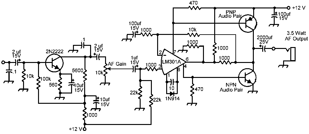 This audio amplifier is described in "A High-Performance Receiver for 160 Meters", Solid State Design for the Radio Amateur, by Wes Hayward and Doug DeMaw, Page 138. This audio amplifier is rated at 3.5 watts and uses a pair of hefty transistors in a push-pull output. I use this amplifier in the receiver. The high performance ability of this amplifier is described on page 138: "There has been no aural evidence of distortion at any signal level while using the circuit of Fig. 40". This includes very weak DX signals for which this audio amplifier really does its best. The LM301 can be ordered from BG Micro at 29 cents each. This part may be difficult to find. They also carry a complimentary pair of output transistors that are used in the output stage of car audio amps - 2N6488/2N6491. Their part number is TRN2N6488/TRN2N6491. Cost is $1.25 a piece. From my experience, this is the best audio amplifier that I have ever built. It is not picky about the type of output transistors. Any PNP-NPN pair in a TO-3, TO-220, TO-040 or TO-043 package advertised for audio circuits work very well. Use landscape setting on your printer when printing this diagram. Right click on the diagram and select View Image, then when it opens in a new browser window, click on Print Settings, select Landscape layout in the appropriate folder, select Fit to Page, and then click on Print. |