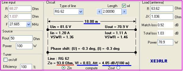 Si en lugar de los 14.341 metros de coaxila agregaramos otras dos medias ondas el resultado sería lo mismo, lo que si cambiría sería la estacionaria afectada por las pérdidas en el coaxial bajaría a 1.20 en lugar de 1.27 y en lugar de 100 watts solo llegarán a la antena 80.2 watts bajo la eficiencia por pérdidas en la linea de alimentación. llegando solo a 80.2% de eficiencia del sistema linea y antena. A pesar de ser muy eficiente la antena la eficiencia total se ve afectada por las caracteristicas de la linea de alimentación.
