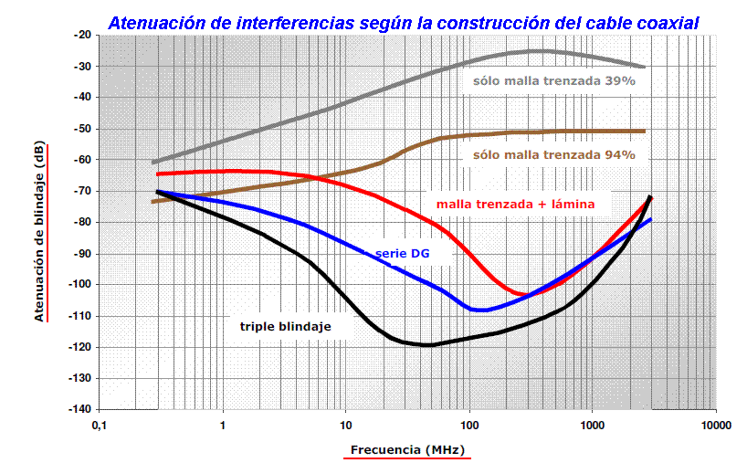 a04.- La malla exterior de la linea coaxial es la encargada de blindarnos del ruido, entre más porcentaje de malla o mayor cobertura del tejillo menor será el ruido captado en nuestro receptor, ya que dicha malla se encuentra con toma a tierra, contrario a las lineas bifilares que no deben de estar aterrizados ninguno de sus conductores, pues en caso de querer blindar una linea bifilar se debería contemplar un tercer conductor o malla que haga esta función en las lineas bifilares o abiertas para que no pierdan el principio de simetría tanto electro magnetica como simetría físisca, que alteren los campos de las linea.