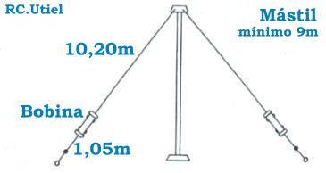 La presente antena y sin las dos bobinas laterales, sería monobanda sólo para (40m.) y con ellas incorporadas nos permitirá trabajar en las bandas de (40/80/15m.) con la ventaja de ocupar un espacio muy reducido respecto al dipolo de media onda para 80m. La longitud total de la antena no supera los 23,10m, frente a los 38,90m, que tendría cualquier dipolo monobanda sin bobinas. Está además, indicada para los recién llegados a la radio. Se recomienda construir primero un dipolo para 40m, sin las bobinas, y, a continuación construir las dos bobinas iguales y añadirlas. Para los ajustes en 80m, se utilizan los rabillos finales, y para los 40m, hay que actuar sobre el hilo de 10,20m, es decir, las bobinas y los rabillos finales, no se tocan.