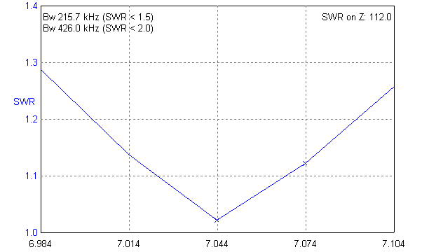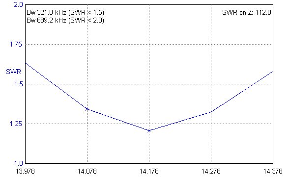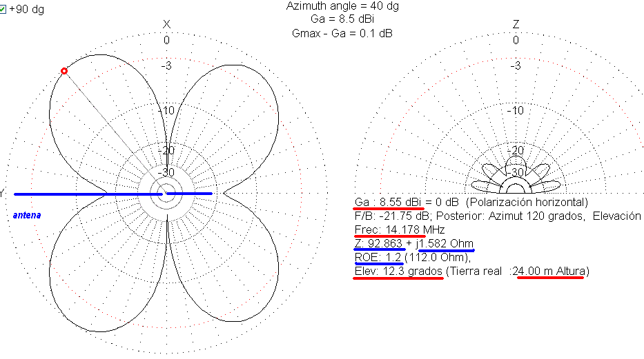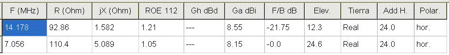 La reactancia de la antena está cercana a cero en las dos bandas con lo cual se logra una buena resonancia, y como consecuencia de lo dicho anteriormente nos genera una buena relación de ondas estacionarias cercana a 1 en las dos bandas, sin sacrificar la gananacia generada a 24 metros de altura sobre el suelo, originando un bajo ángulo de radiación menor a 13 grados en la banda de 20 metros y menor a 25 grados en la banda de 40 metros, desde luego se puede apreciar que la montamos para que nos dé una polarización orizontal.