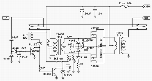 Diferentele fata de schema originala sunt foarte mici. Acest amplificator il alimentez la tensiune mai mare, de 30V, caz in care consuma la puterea maxima cca. 8A. Releul de comutare emisie/receptie este alimentat printr-o dioda Zenner pentru limitarea tensiunii. Iesirea se face pe direct fara condensator. Am proiectat si un cablaj imprimat care sa corespunda noilor cerinte. Transformatorul de intrare se realizeaza foarte usor dintr-un balun TV de dimensiuni mai mari si se bobineaza in primar 5 spire iar in secundar 2 spire. Tensiunea de polarizare a tranzistoarelor finale este stabilita la valoarea de 2,9V, din experimentari, pentru a asigura regimul de lucru liniar in clasa AB.
