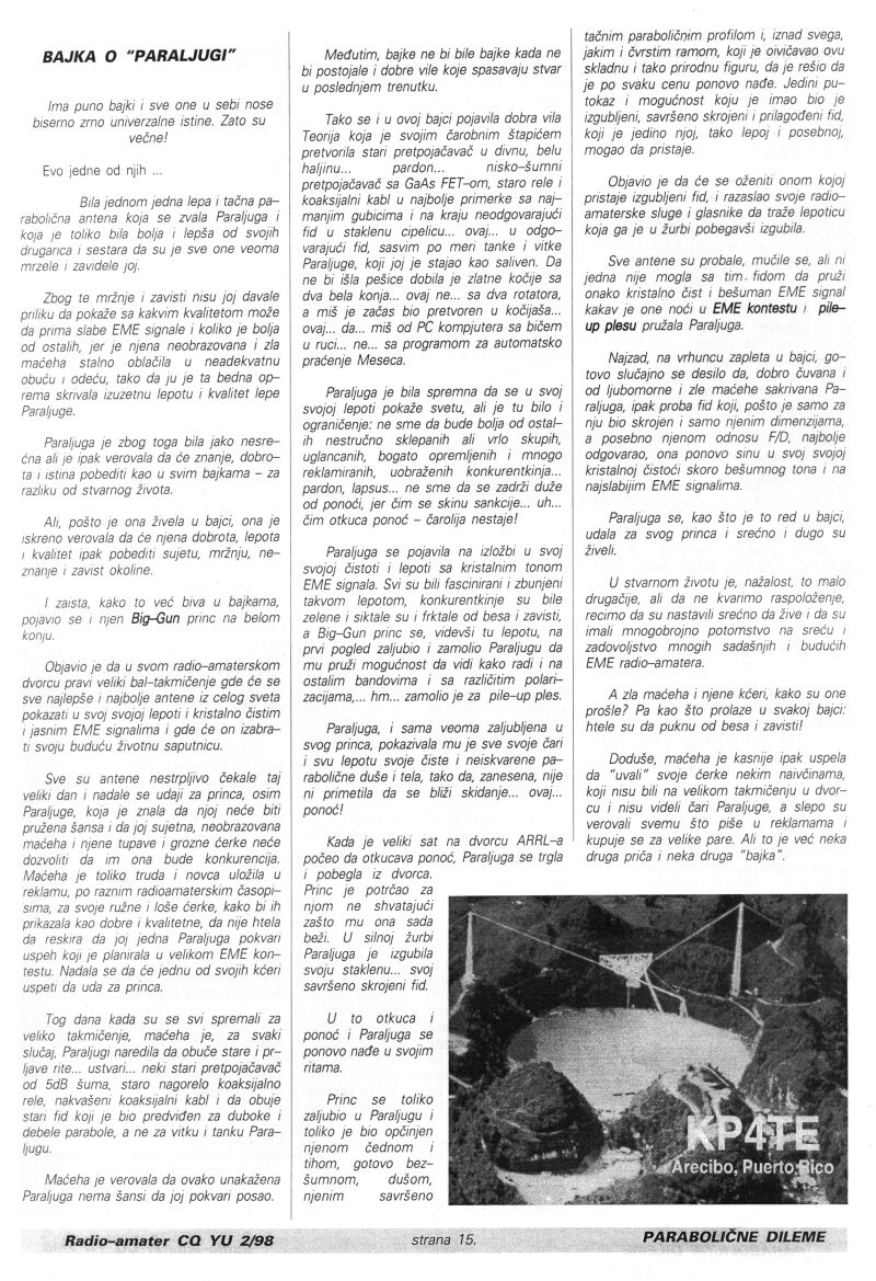 Pročitajte kako je pravljena i finansirana antena na gornjoj slici, šta je urađeno sa njom, kako je snimljen misteriozni LDE (Long Delayed Echo), postoji li fizika i "metafizika" EME veze, kako su se "prijatelji" radovali što je " komšiji crkla antena", kako zamalo nije "spaljen" satelit AO-10 i još mnogo toga ...