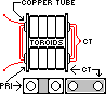 T2 is formed from, 8 pcs Amidon Toroids 1/2" OD mark color=yellow, 2 pcs automotive copper tubing 1/8" OD and copper clad as shown in the above pic are used for the pri winding, while the secondary is wound inside the copper tubes.