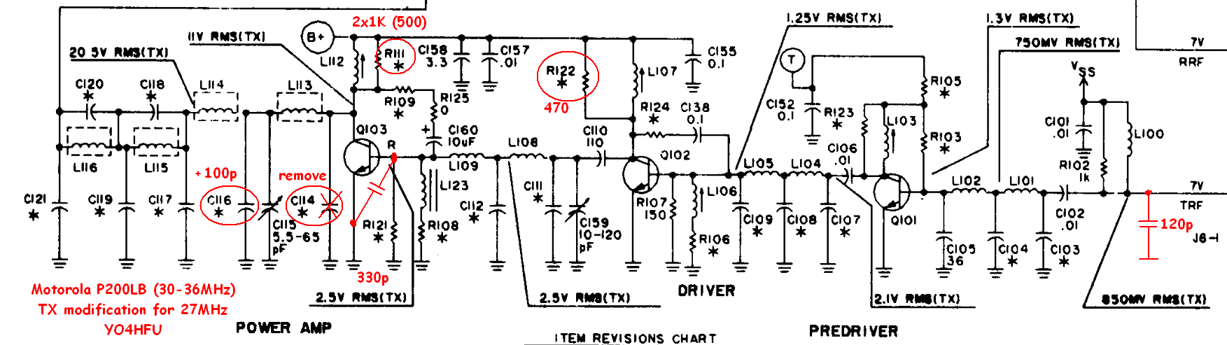 Coupling capacitors are located between LC circuits and transistors base, were increased from 10pF to 18pF for RX and from 17pF to 40pF (22+18pF) for TX.