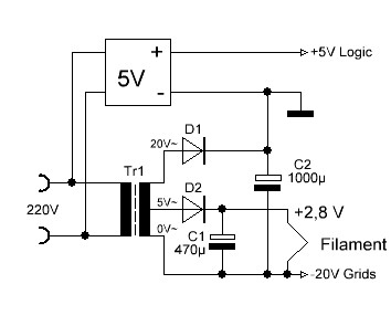 Multe din terminalele controlerului nu sunt folosite in schema actuala a radioului. A fost nevoie de cateva terminale din fire subtiri pentru a repozitiona contactele rozetei de pe partea frontala cu tastele <UP><DWN><LEFT><RIGHT><OK>. Deasemenea configuratia de alimentare a afisajului VFD am schimbat-o cu un alimentator separat care trebuia sa livreze tensiunile specifice: