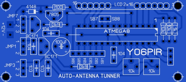 Am construit acest AAT pe un cablaj imprimat conceput de mine, deoarece am dorit amplasarea separata a uC Atmega8 si LCD-ul 2x16, fata de restul montajului. Cablajul se aseaza exact peste dimensiunile LCD-ului.