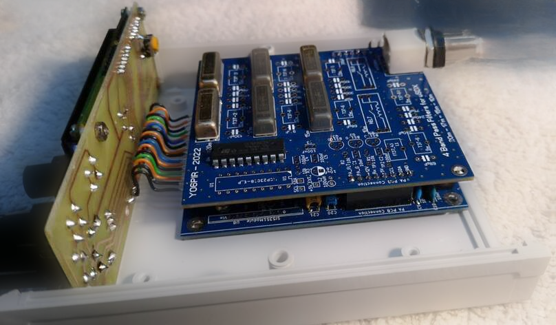 La intrarea transceiverului se afla blocul de filtre LPF modificate pe rezonanta serie pentru a realiza si functia de filtre selective de intrare. Aceasta placa de filtre este montata peste placa de baza; comanda releelor se face pe bus-ul de date I2C care comanda si oscilatorul DDS cu Si5351.