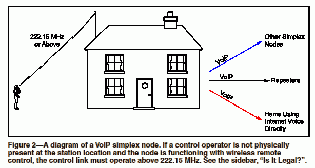 Figura 2- O schema a unui nod (statie) VoIP. Daca seful statiei (operatorul de control) nu se afla prezent la statie si acest nod functioneaza cu control de la distanta, aceasta legatura trebuie sa opereze deasupra frecventei 222.15MHz. Vezi articolul "Este legal?"
