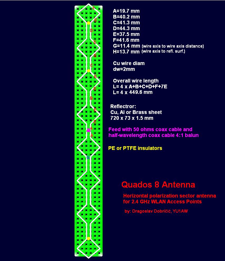New horizontal polarization antenna with 8 Quads and coverage angle of 70 deg. for -3 dB and 90 deg. for -6 dB for 2.4 GHz Wireless LAN Access Points.
