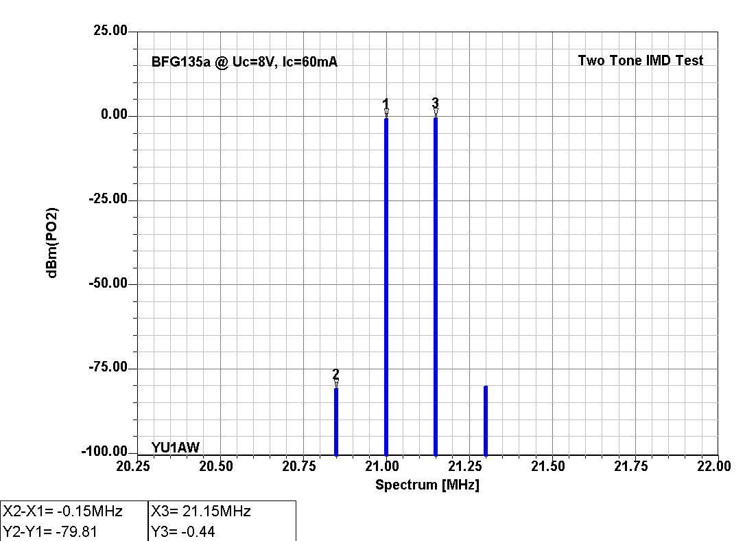 Da bi se proverilo ponašanje pojačavača u DX radu i takmičenjima na opsegu od 50 MHz izvršene su simulacije na računaru. "Tri jače stanice na 6m opsegu" simulirane su sa tri signala od po 7.1 mV (-30 dBm) na ulazu pojačavača sa bipolarnim tranzistorom BFG135a. Izlazni spektar, tj. ono što bi se u praksi dobilo, odnosno čulo, sa idealnim prijemnikom bez sopstvene IMD, u takvim uslovima, pokazao je superiornu dinamiku pojačavača sa BFG135a i dat je na slici: