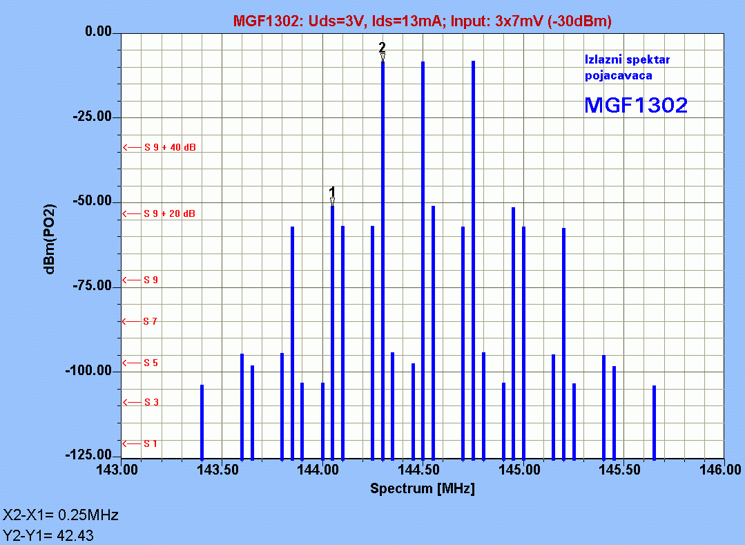 Da bi se proverilo ponašanje pojačavača u takmičenjima izvršene su simulacije na računaru. "Tri jače stanice na 2m opsegu" simulirane su sa tri signala od po 7.1 mV (-30 dBm) na ulazu pojačavača sa GaAs FET-om MGF1302 i sa bipolarnim tranzistorom BFP196. Izlazni spektar, tj. ono što bi se u praksi dobilo, odnosno čulo, sa idealnim prijemnikom bez sopstvene IMD, u takvim uslovima, pokazali su veliku prednost pojačavača sa BFP196 i dati su na sledećim slikama:
