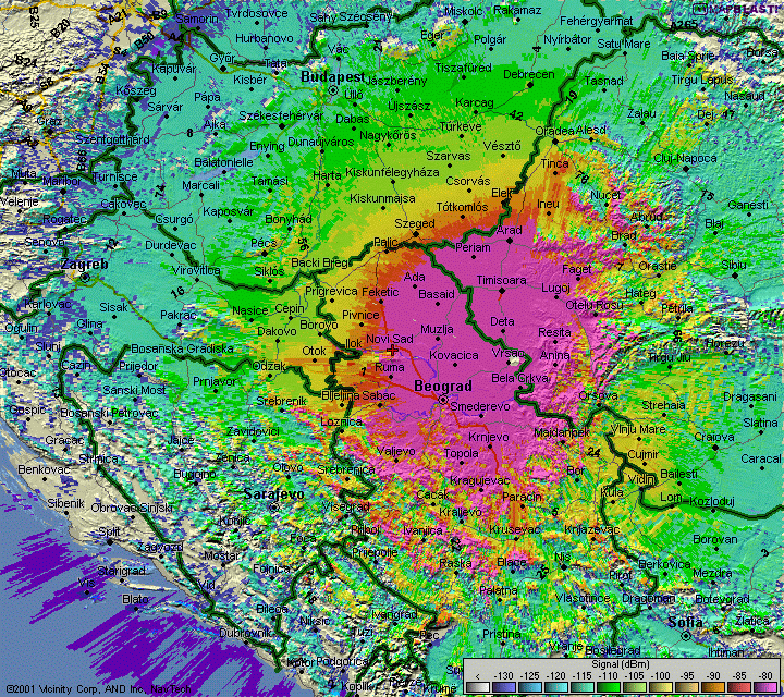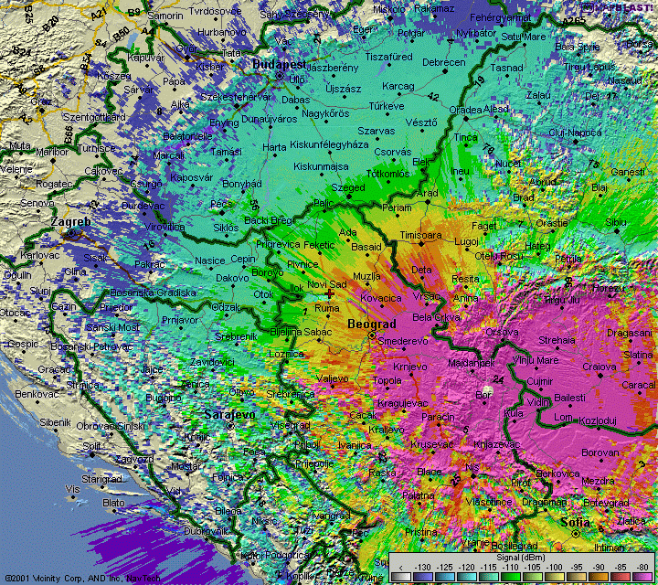 određenog pravca na 144 MHz. Na karti su date veličine prijemnnog signala zavisno od lokacije, tako da se mogu porediti razne lokacije,