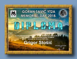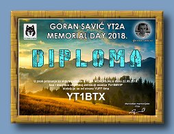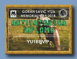Diplome - YU1BBV/P - YT2A Memorijal 2018