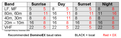 - 8 baud for weak signal MF and transition periods (sunrise/sunset) on 80 and 40 metres.