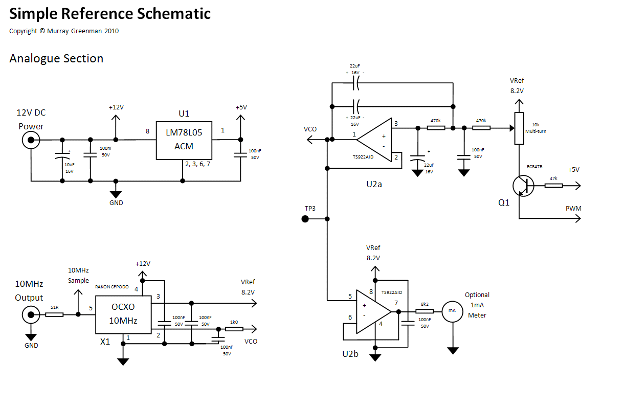 Follow the full-size Simple Reference Analog Schematic as you read this description. Power for the unit comes from an external 12V regulated source (typically a switch-mode wall-wart), which directly operates the OCXO. The connector is the usual coaxial power connector. A small regulator U1 provides power for the logic section. No standby power is provided, although a 12V 7AH SLA could be used with an appropriate switch-over diode and charging arrangement. The steady state current draw from 12V is 200mA, and the same supply could operate the GPS module.The OCXO X1 has an internal buffer designed to drive 50 Ohm. The output is able to drive 1V p-p into 50 Ohm (+4dBm). The series resistor can be omitted (gives +10dBm) if there is no risk of mis-connection which may cause damage. The OCXO provides a low noise, temperature stable 8.2V reference, which is used by the level shifter, centering pot and low pass filter. These provide the control voltage for the OCXO, and amount to a highly stable and linear monotonic PWM-operated 14-bit D-A converter. The same design should work with OCXO references down to 5V.