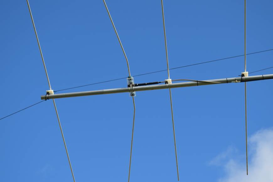 The Yagi boom is supported with two sets of top truss ropes and mounted at 7m high on a 60mm diameter steel pipe and a short 'stub mast' above a thrust bearing. The mast base is fixed to a wooden post with a hinge and was raised using the hydraulic 'arms' on my tractor. The antenna is manually rotated and fixed in position with a light rope tied to the back of the boom ...