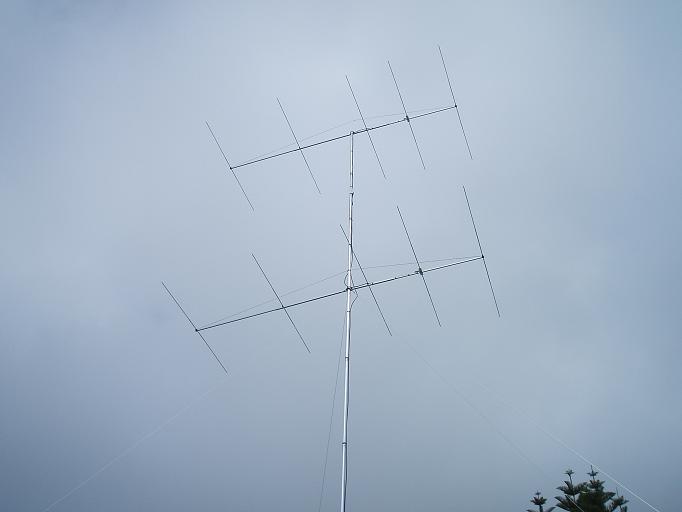 Picture taken looking due West from the Captain Cook Memorial lookout. Update as at 00:00 UTC on 30 March 2012 6m news via ionospheric propagation: I'm making a short CQ on 50.110.6 once every 3 minutes or so with the auto-keyer when 6m is likely to be open. When there is an opening with good propagation I have been QSYing to 50.104 or 50.105 for CW and SSB QSOs. A nice opening on 28/29 Mar to VE7 and the NW USA with over 70 stations worked. Nothing further south except one or two W6 stations. TI7/N5BEK also heard. The KH6 beacons were S9 at around 07:30 utc last night, and Fred KH7Y was very loud. A few JAs and one DU worked from the NW direction yesterday. The 49.750 vids were weak. A few stations from NA have looked for my JT65A CQs on 50.190 at moon rise and so we have managed "direct" digital QSOs with N6KK and K7CW when 6m apprears "closed". Obviously the band is marginally open and the sensitivity of JT65A makes the difference. My moon rise direction is still close towards the NA azimuth for the next few days. See the table towards the bottom of this page for my moon rise times. If you decode or hear my digital signal, please call. I am not propagation mode or signal mode specific and am more than happy to work anyone, anywhere, anytime on any mode via any means! :-) 6m news via EME propagation: The ground gain lobe and nulls are now very well defined and it is pointless operating with the moon any higher than 10 degrees here where the first null starts. Due to the antenna system being stacked 5/5 Yagis there are no higher lobes. To this end, I will finish earlier on moon rise windows and start later on moon set windows (therefore the window times given below will be 10 or so minutes shorter in each case). EME conditions the last 2 windows have been VERY difficult ... rapid QSB, etc ... but the best EME conditions by far are still to come early next week! Good luck to all. New stations worked via EME: G4IGO -25 New EME callers decoded: LZ2WO OK7XX W7MEM (both via moon echo and via ionosphere simultaineously) G5WQ and a few other traces ... Pictures of the antenna system during assembly and when first raised