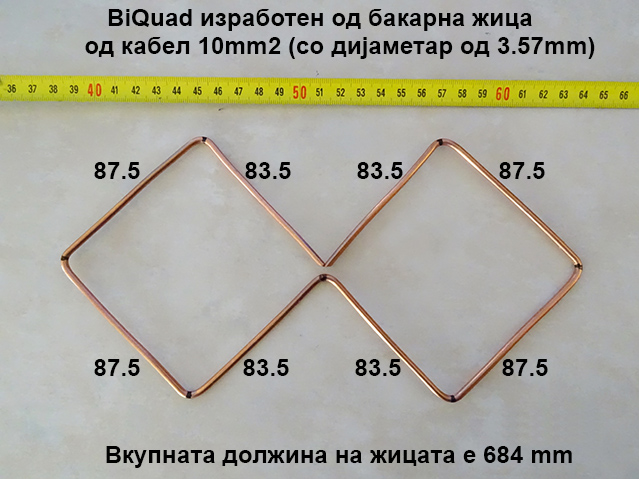 - Bi-Quad елементот е изработен од месингена електрода со дијаметар 2.5 mm или бакарна жица (без изолација) со ист дијаметар.