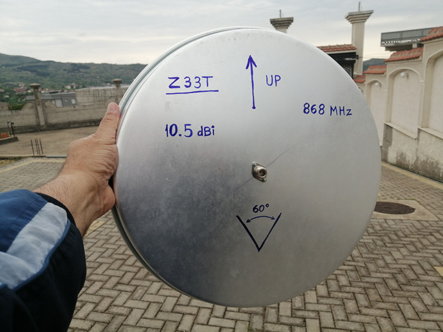 BiQUAD-антена изработена со рефлктор од округла алуминиумска тава со дијаметар од 420mm: