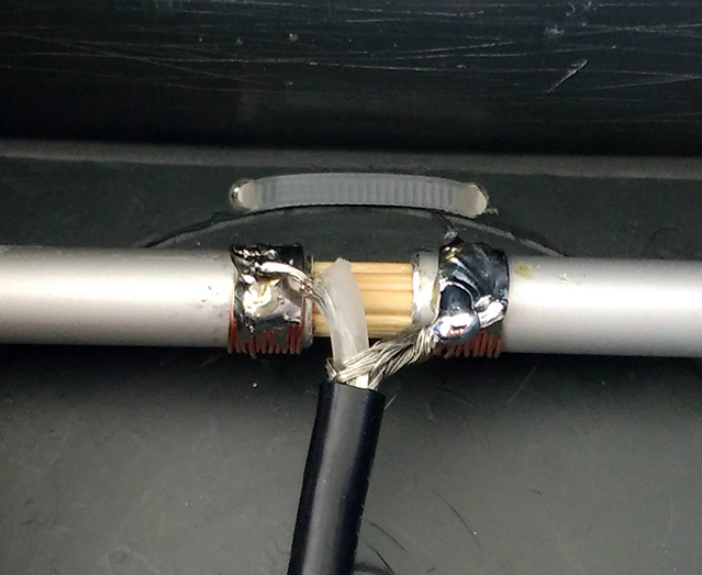 Најнапред на диполот, на местото каде треба да се приклучи коаксијалниот кабел, бев поставил метални стеги. Ги калаисав и го залемив кабелот на нив. При мерење на SWR-от, добив најниска вредност од 1:1.5 на средината на радиоаматерското подрачје (145 MHz), а на краевите од опсегот (144 и 146 MHz) SWR-от беше уште полош.